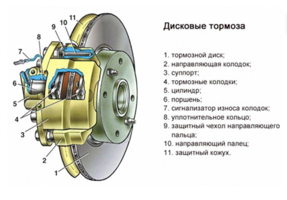 После этого тормозная жидкость по трубкам, шлангам направляет давление к тормозным механизмам на колесах (дисковым либо барабанным), что приводит их в действие. В тормозах дискового типа поршень суппорта обеспечивает прижим колодки к диску. В результате создаваемого трения вращение колеса прекращается.